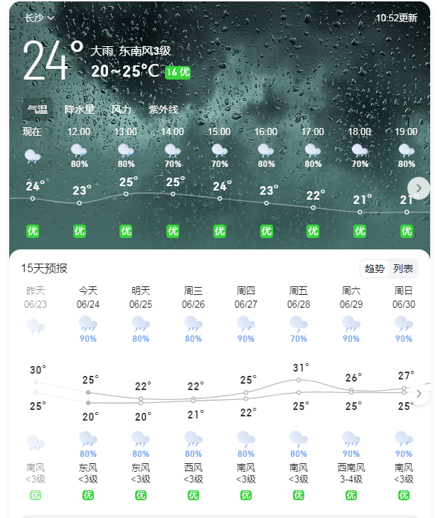 湖南省气象台06月24日06时发布暴雨橙色预警:预计24日08时至25日08时,长沙、株洲、湘潭、衡阳、邵阳、岳阳南部、益阳南部、永州北部、怀化、娄底部分地区将出现暴雨,局地大暴雨,并伴有短时强降水、雷雨大风等强对流天气,请加强防范。